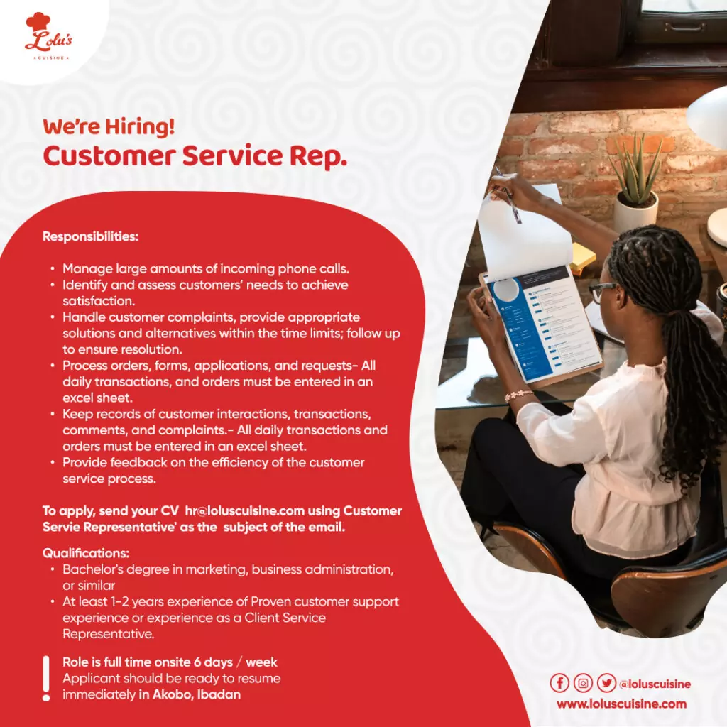 Send your CV hr@loluscuisine.com using ‘Customer Service Representative’ as the subject of the email.