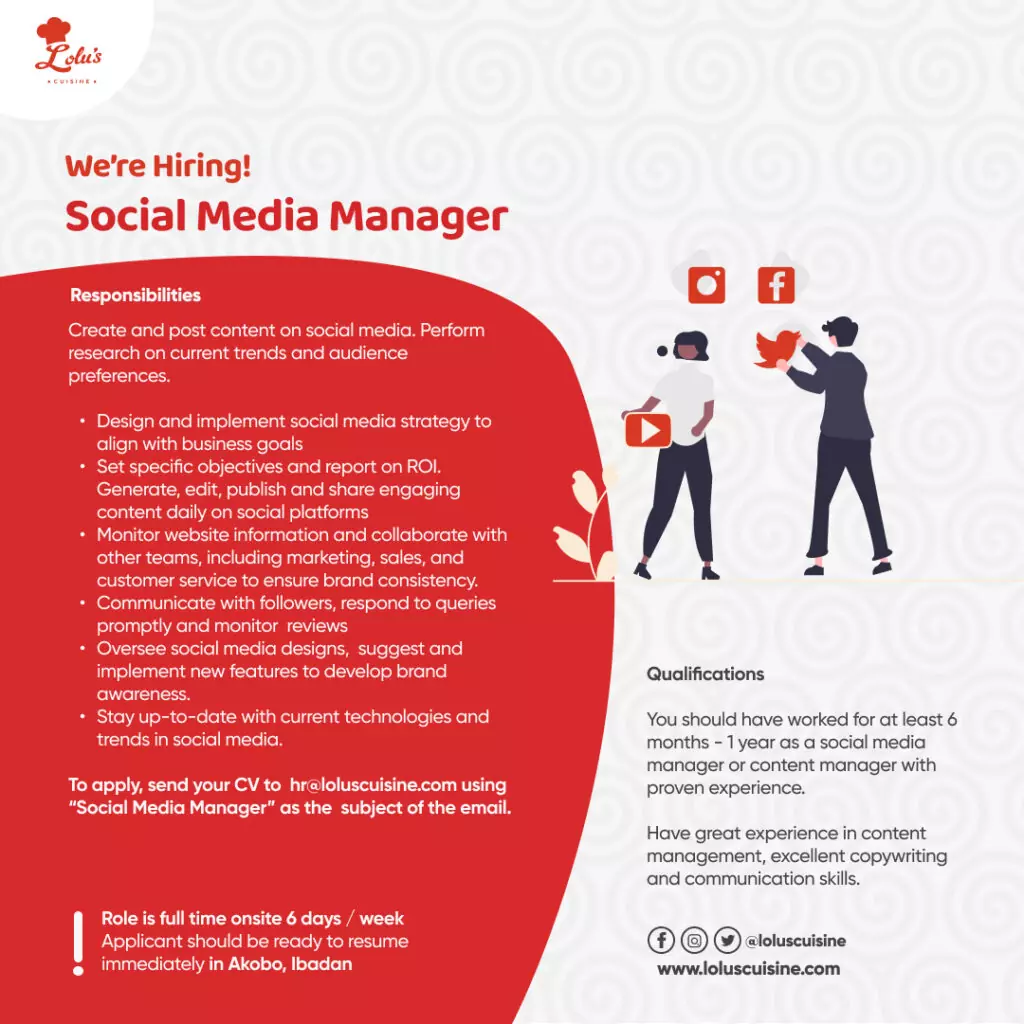 Come work with us at Lolu’s Cuisine. Join a team of ambitious people creating the best culinary experience for thousands of people monthly. Note that all roles are full time, 6 days a week at our kitchen in Akobo, Ibadan.