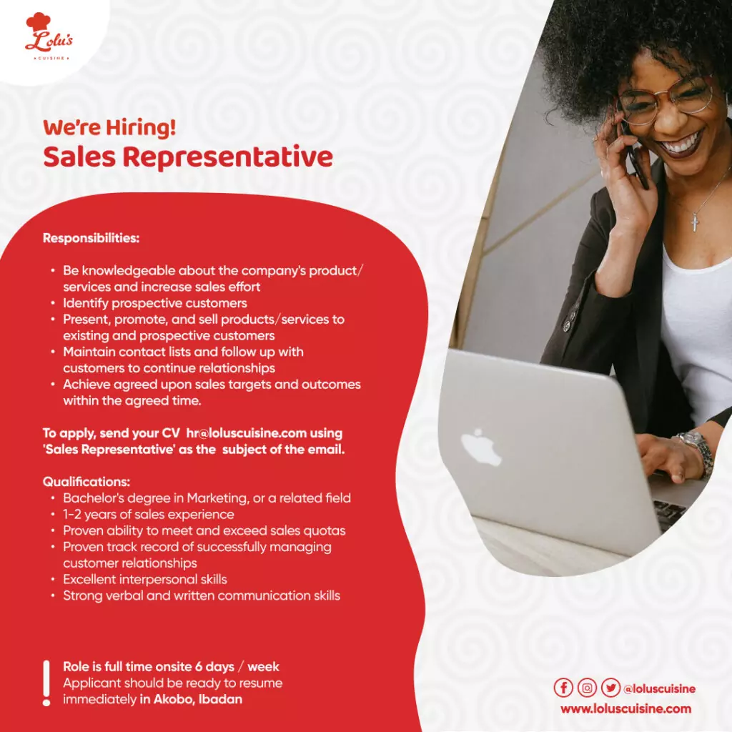 Send your CV hr@loluscuisine.com using ‘Sales Representative’ as the subject of the email.