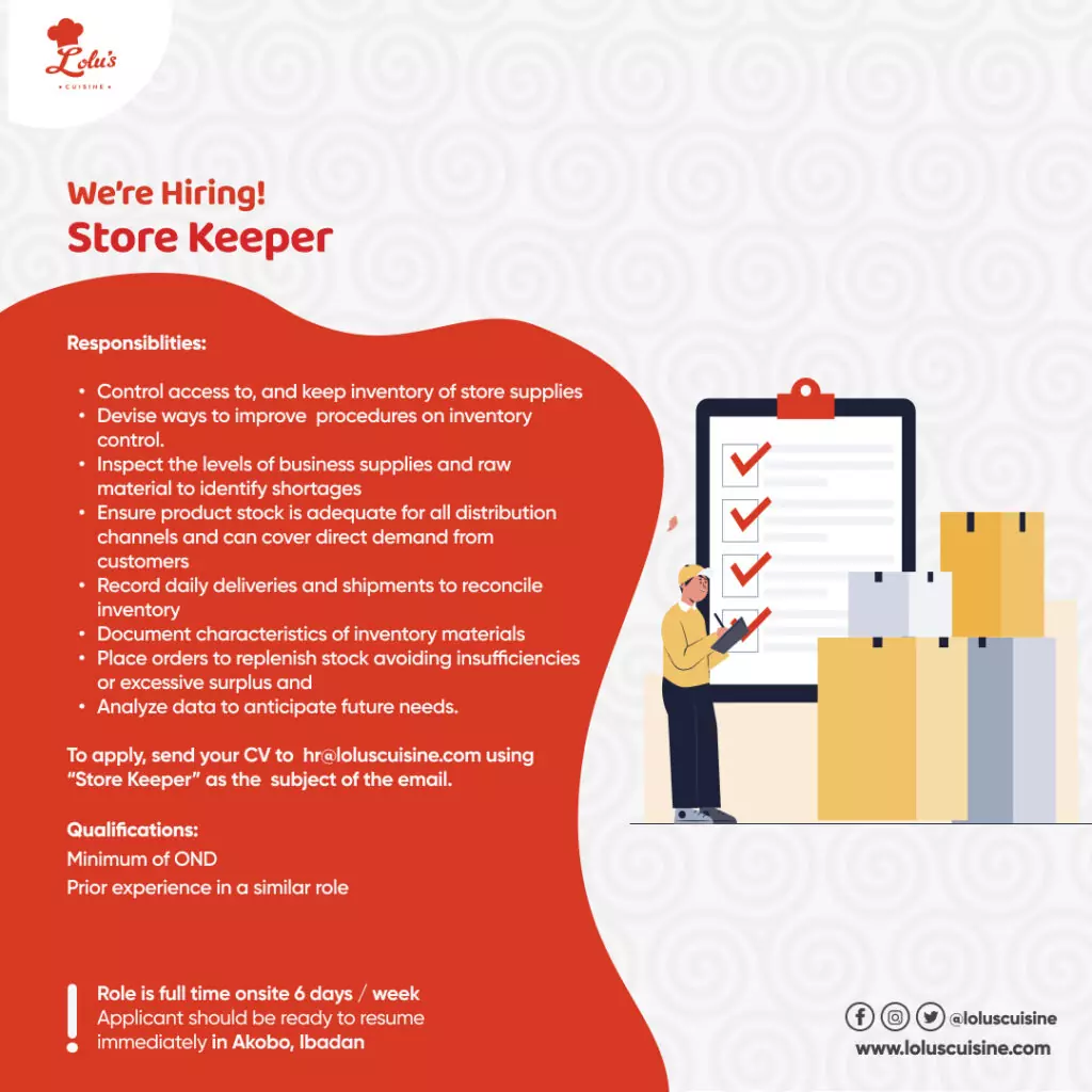 Send your CV hr@loluscuisine.com using ‘Store Keeper’ as the subject of the email.