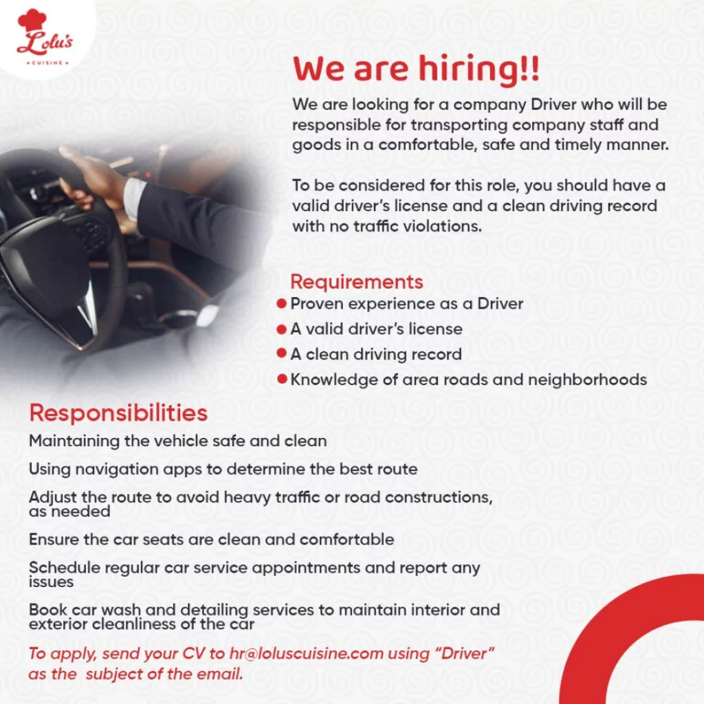 Send your CV hr@loluscuisine.com using ‘Driver’ as the subject of the email.
