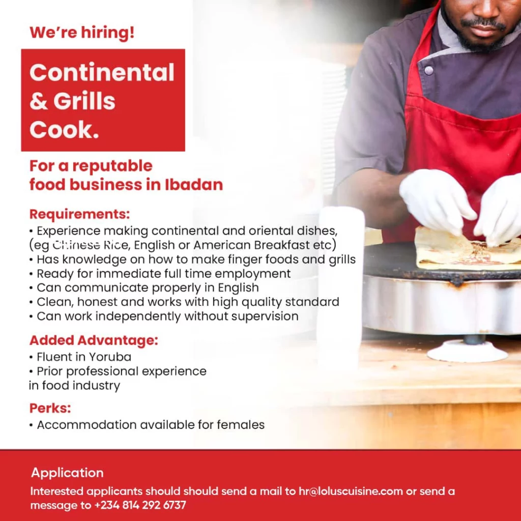 Send your CV hr@loluscuisine.com using ‘Continental Cook’ as the subject of the email.